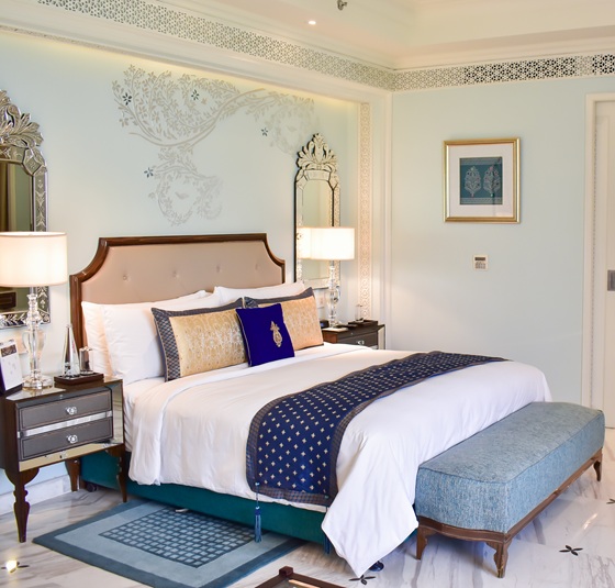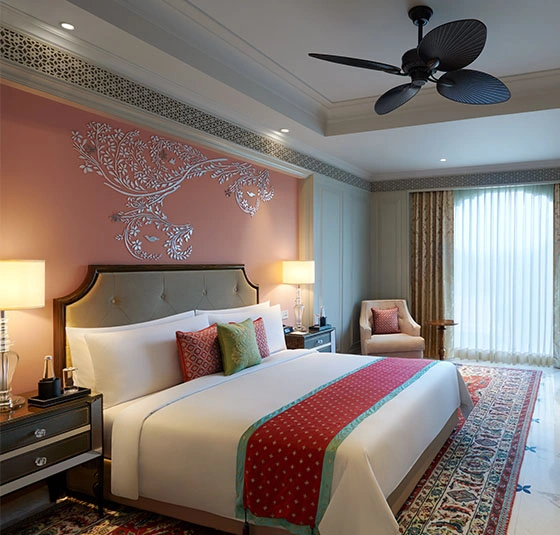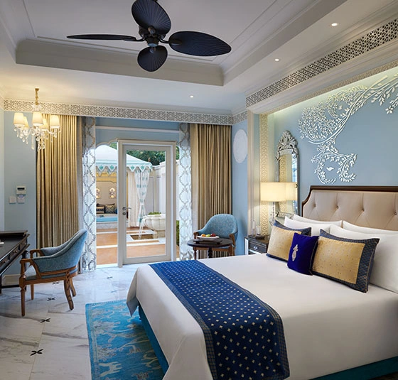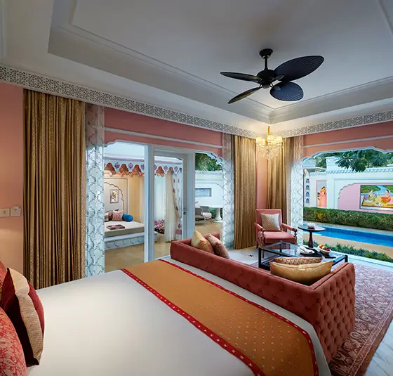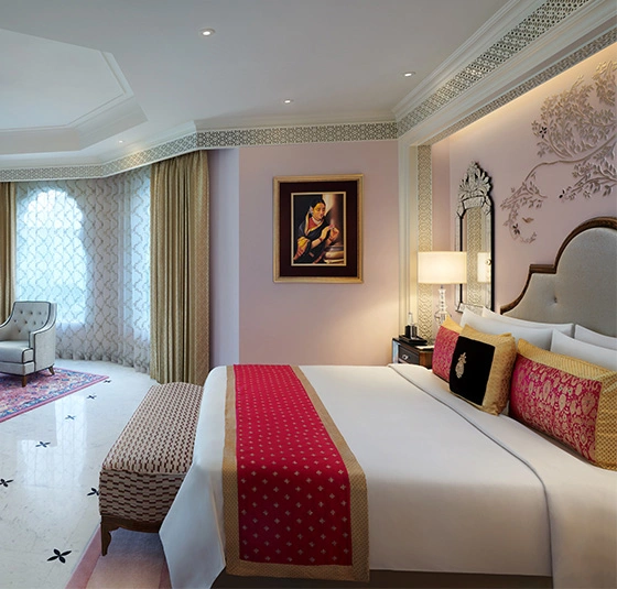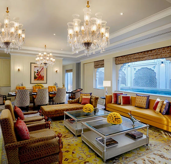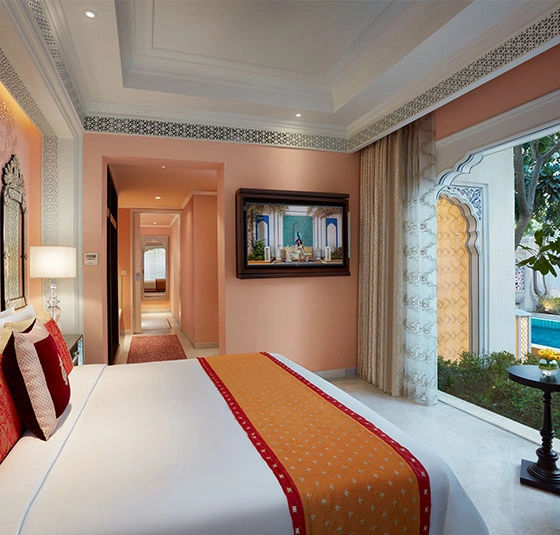Mute The Leela Palace JaipurA majestic ode to Rajasthan’s regal heritage, The Leela Palace Jaipur is a luxury hotel in Jaipur nestled in serene surrounds far from the city's bustle, where every moment echoes the grandeur of a bygone era.A graceful fusion of Rajputana and Mughal splendour, this 5-star hotel in Jaipur enchants with gleaming white façades, intricate jaalis, and silver-trimmed chhatris. Stroll through marble corridors inlaid with parchin kari, past shimmering thikri mirrorwork and frescoes that reverberate regal tales of yore. Recline in breezy pavilions beside marble fountains, then as dusk falls, gather by the pool for an enchanting Rajasthani folk gala.Dine under starlit skies with the Aravallis on the horizon, before retreating to your boudoir - a sanctuary of comfort and splendour. At every turn, The Leela Palace Jaipur, a celebrated 5-star hotel in Jaipur, is a tribute to timeless Indian luxury, resplendent in every detail. Stay & Revel Maharaja Suite Royal Suite Royal Villa with Plunge Pool Royal Villa with Courtyard Grand Villa with Terrace Grand Villa Palace Suites Palace Rooms Curated Offers Festive Getaway Polo in the Pink City Season 4 Leela DISCOVERY Member Special The Leela Palace Trail Time Travel with The Leela View All Epicurean Delights Jamavar An ode to Royal Kitchens of India The Aravalli Dining Room Global cuisine atelier where culinary innovation meets timeless regional elegance. Jharokha Bar Poolside bliss with rare malts, signature Aujasya cocktails, and the glow of lotus chandeliers. The Amber Terrace Inspired by a mythical Royal Conservatory, the bar and restaurant reflects the belief that every part of a plant symbolizes life. Celebrations & Conferences CelebrationsIntimate celebrations to grand galas, making every occasion timeless. Enquire Now Factsheet MeetingsAllow us to orchestrate every detail, so your meetings flow effortlessly. Enquire Now Factsheet The Leela Palace JaipurHotel CoordinatesHotel Address:Jaipur-Delhi Highway, NH 11, Kukas, Jaipur, Rajasthan - 30202860 mins from International Airport Telephone: +91 142 6350 000 Hotel Factsheet FAQs Enquire Now You must have JavaScript enabled to use this form. Name phone Phone Email Hotel*The Leela Palace Jaipur Purpose of EventWeddingsCelebrations Need a stay?YesNo Additional Information I agree to receive updates, offers, via sms, rcs & Whatsapp. Mobile Number Enquire Now You must have JavaScript enabled to use this form. Name Phone Email Hotel*The Leela Palace Jaipur Additional Information I agree to receive updates, offers, via sms, rcs & Whatsapp. Mobile Number